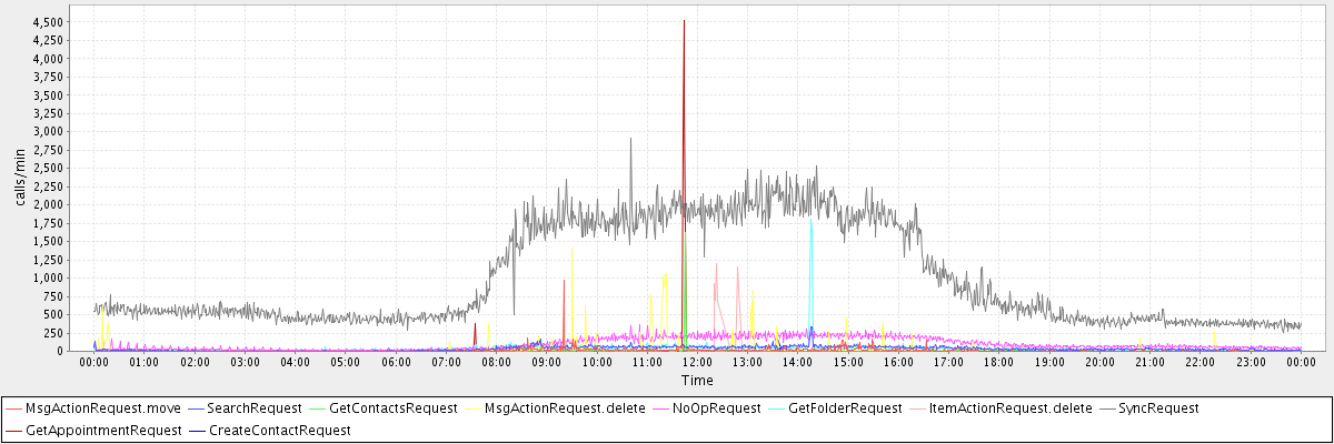 max(MsgActionRequest.move) = 964.00 max(SearchRequest) = 338.00 max(GetContactsRequest) = 1623.00 max(MsgActionRequest.delete) = 1409.00 max(NoOpRequest) = 365.00 max(GetFolderRequest) = 1809.00 max(ItemActionRequest.delete) = 1203.00 max(SyncRequest) = 2908.00 max(GetAppointmentRequest) = 4516.00 max(CreateContactRequest) = 170.00