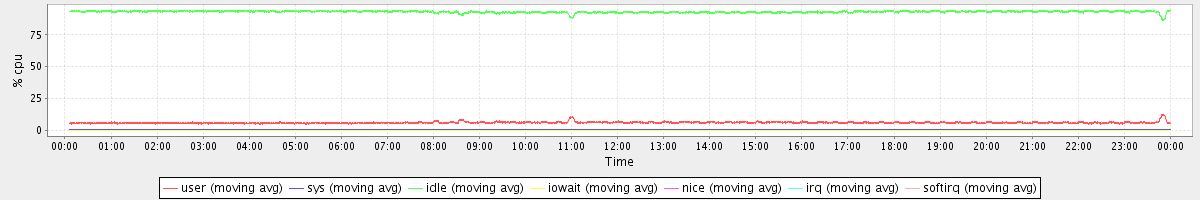 avg(user) = 6.09 avg(sys) = 0.62 avg(idle) = 93.17 avg(iowait) = 0.02 avg(nice) = 0.00 avg(irq) = 0.00 avg(softirq) = 0.08