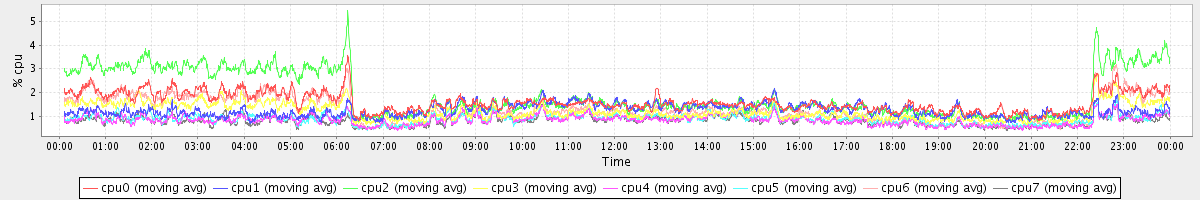 avg(cpu0) = 2.14 avg(cpu1) = 5.33 avg(cpu2) = 19.48 avg(cpu3) = 5.00 avg(cpu4) = 1.32 avg(cpu5) = 1.63 avg(cpu6) = 12.35 avg(cpu7) = 1.57