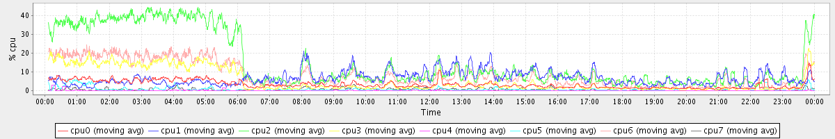 avg(cpu0) = 2.16 avg(cpu1) = 0.82 avg(cpu2) = 0.67 avg(cpu3) = 0.74 avg(cpu4) = 0.08 avg(cpu5) = 0.21 avg(cpu6) = 0.49 avg(cpu7) = 0.26