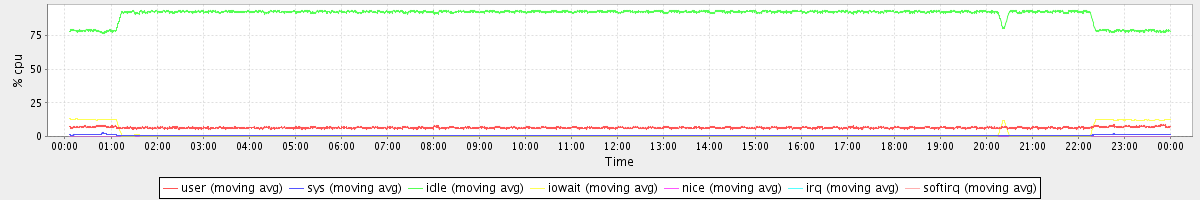 avg(user) = 6.48 avg(sys) = 0.70 avg(idle) = 91.15 avg(iowait) = 1.65 avg(nice) = 0.00 avg(irq) = 0.00 avg(softirq) = 0.01