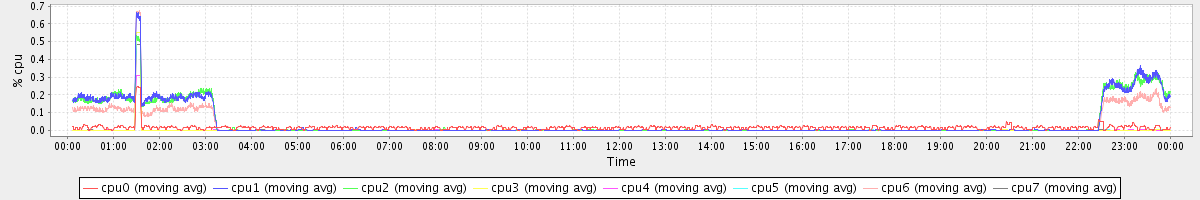 avg(cpu0) = 1.04 avg(cpu1) = 1.14 avg(cpu2) = 0.94 avg(cpu3) = 0.70 avg(cpu4) = 0.51 avg(cpu5) = 0.46 avg(cpu6) = 0.51 avg(cpu7) = 0.35