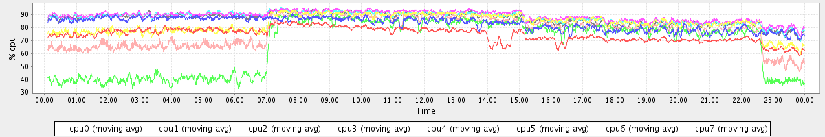 avg(cpu0) = 74.69 avg(cpu1) = 83.29 avg(cpu2) = 67.04 avg(cpu3) = 83.22 avg(cpu4) = 89.04 avg(cpu5) = 87.95 avg(cpu6) = 77.06 avg(cpu7) = 87.15