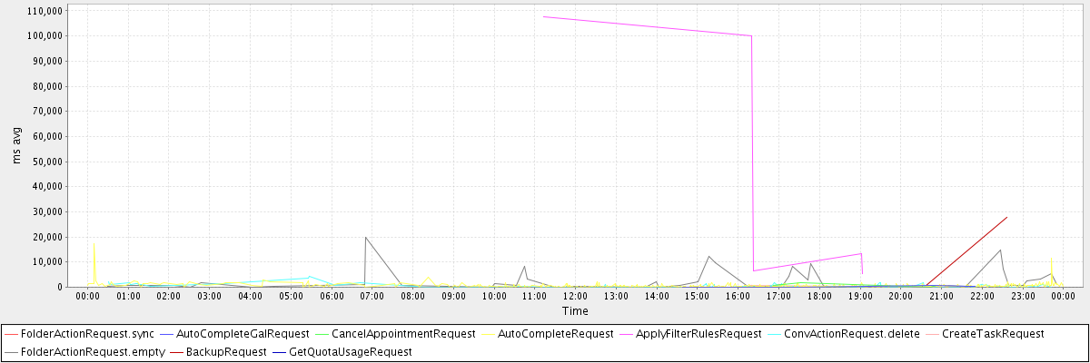avg(FolderActionRequest.sync) = 3892.00 avg(AutoCompleteGalRequest) = 235.29 avg(CancelAppointmentRequest) = 776.00 avg(AutoCompleteRequest) = 578.67 avg(ApplyFilterRulesRequest) = 46524.80 avg(ConvActionRequest.delete) = 531.77 avg(CreateTaskRequest) = 284.50 avg(FolderActionRequest.empty) = 2691.08 avg(BackupRequest) = 14079.50 avg(GetQuotaUsageRequest) = 1312.00