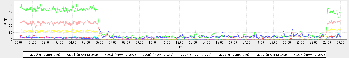 avg(cpu0) = 1.59 avg(cpu1) = 3.90 avg(cpu2) = 15.96 avg(cpu3) = 3.93 avg(cpu4) = 0.93 avg(cpu5) = 1.16 avg(cpu6) = 9.70 avg(cpu7) = 1.08