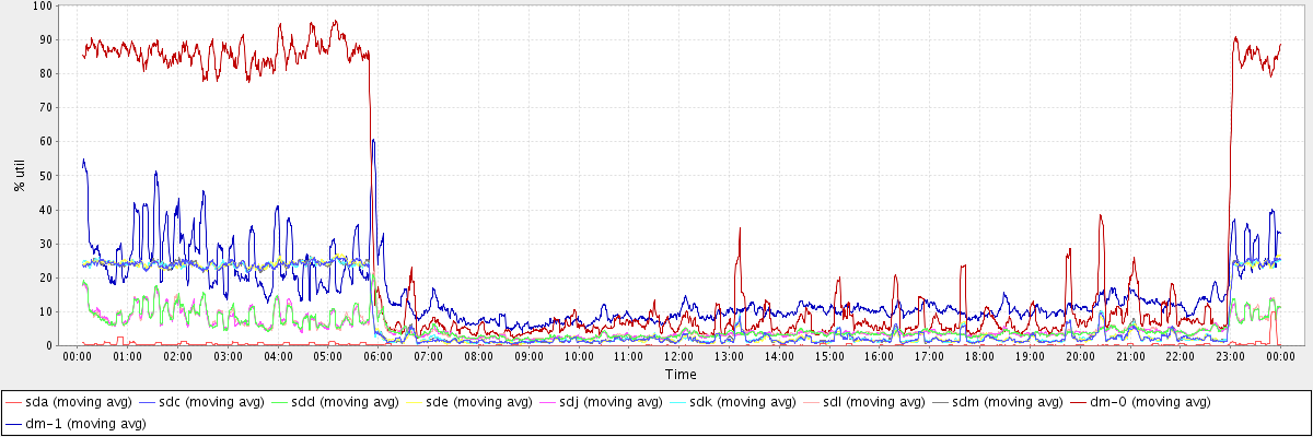 avg(sda) = 0.32 avg(sdc) = 8.34 avg(sdd) = 5.21 avg(sde) = 8.33 avg(sdj) = 5.17 avg(sdk) = 8.36 avg(sdl) = 5.27 avg(sdm) = 8.37 avg(dm-0) = 30.08 avg(dm-1) = 15.30