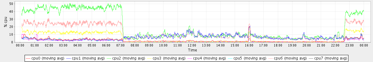 avg(cpu0) = 21.68 avg(cpu1) = 11.20 avg(cpu2) = 12.10 avg(cpu3) = 10.21 avg(cpu4) = 8.68 avg(cpu5) = 9.67 avg(cpu6) = 10.37 avg(cpu7) = 10.14
