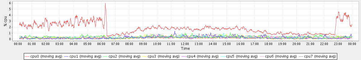 avg(cpu0) = 1.82 avg(cpu1) = 0.28 avg(cpu2) = 0.35 avg(cpu3) = 0.20 avg(cpu4) = 0.15 avg(cpu5) = 0.17 avg(cpu6) = 0.26 avg(cpu7) = 0.18