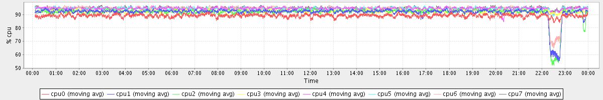 avg(cpu0) = 89.18 avg(cpu1) = 91.66 avg(cpu2) = 91.56 avg(cpu3) = 92.26 avg(cpu4) = 94.43 avg(cpu5) = 94.38 avg(cpu6) = 94.27 avg(cpu7) = 94.82