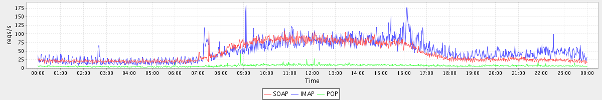 Host zm04.stanford.edu: Mailboxd: Request Rate by Client Protocol