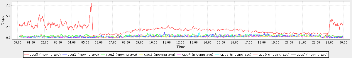 avg(cpu0) = 1.94 avg(cpu1) = 0.34 avg(cpu2) = 0.43 avg(cpu3) = 0.28 avg(cpu4) = 0.23 avg(cpu5) = 0.28 avg(cpu6) = 0.32 avg(cpu7) = 0.26
