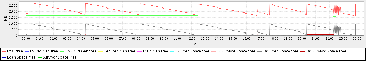 avg(total free) = 2184.48 avg(PS Old Gen free) = 0.00 avg(CMS Old Gen free) = 1636.40 avg(Tenured Gen free) = 0.00 avg(Train Gen free) = 0.00 avg(PS Eden Space free) = 0.00 avg(PS Survivor Space free) = 0.00 avg(Par Eden Space free) = 483.78 avg(Par Survivor Space free) = 64.31 avg(Eden Space free) = 0.00 avg(Survivor Space free) = 0.00