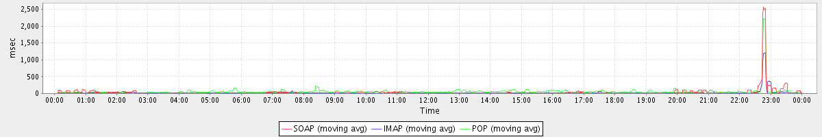 avg(DeleteAccountRequest) = 2128.00 avg(BrowseRequest) = 12645.00 avg(SyncGalRequest) = 12992.51 avg(CheckRecurConflictsRequest) = 912.00 avg(FolderActionRequest.delete) = 636.33 avg(AutoCompleteRequest) = 638.74 avg(ApplyFilterRulesRequest) = 4396.50 avg(SearchGalRequest) = 618.77 avg(FolderActionRequest.empty) = 2855.92 avg(GetQuotaUsageRequest) = 1385.00