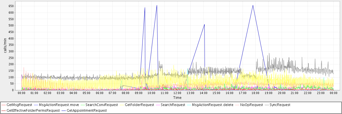 max(GetMsgRequest) = 38.00 max(MsgActionRequest.move) = 52.00 max(SearchConvRequest) = 51.00 max(GetFolderRequest) = 193.00 max(SearchRequest) = 121.00 max(MsgActionRequest.delete) = 165.00 max(NoOpRequest) = 176.00 max(SyncRequest) = 286.00 max(GetEffectiveFolderPermsRequest) = 57.00 max(GetAppointmentRequest) = 656.00
