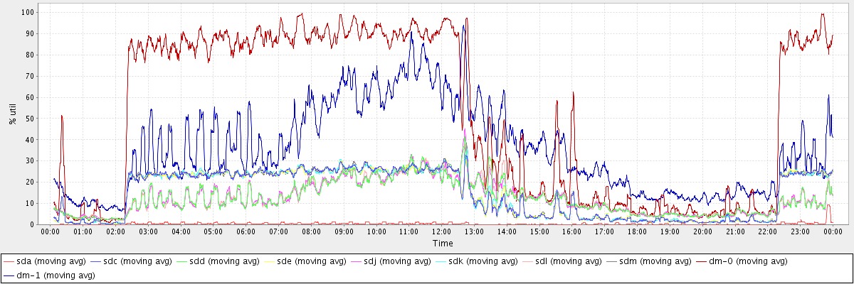 avg(sda) = 0.45 avg(sdc) = 14.44 avg(sdd) = 12.34 avg(sde) = 14.43 avg(sdj) = 12.38 avg(sdk) = 14.45 avg(sdl) = 12.43 avg(sdm) = 14.40 avg(dm-0) = 51.20 avg(dm-1) = 35.12