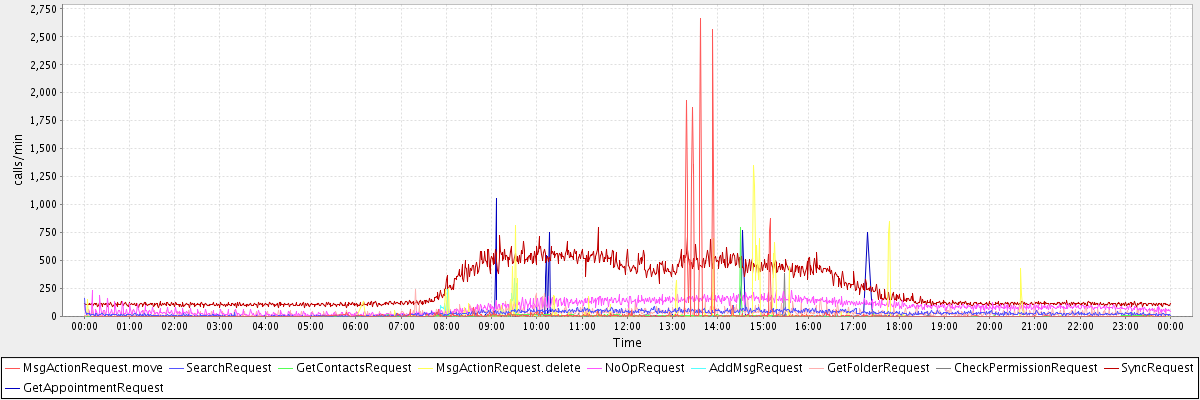 max(MsgActionRequest.move) = 2661.00 max(SearchRequest) = 164.00 max(GetContactsRequest) = 799.00 max(MsgActionRequest.delete) = 1352.00 max(NoOpRequest) = 229.00 max(AddMsgRequest) = 338.00 max(GetFolderRequest) = 245.00 max(CheckPermissionRequest) = 381.00 max(SyncRequest) = 792.00 max(GetAppointmentRequest) = 1059.00