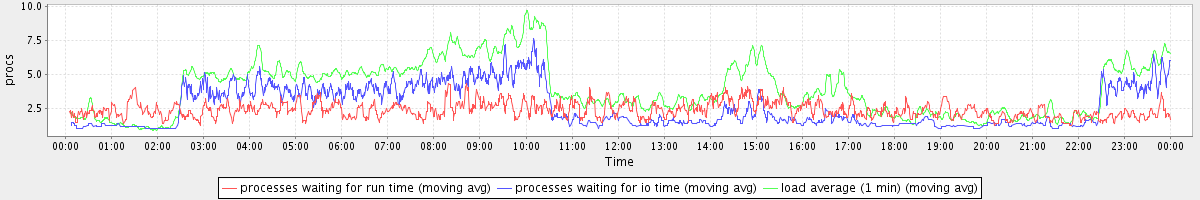 avg(processes waiting for run time) = 1.63 avg(processes waiting for io time) = 2.08 avg(load average (1 min)) = 3.93