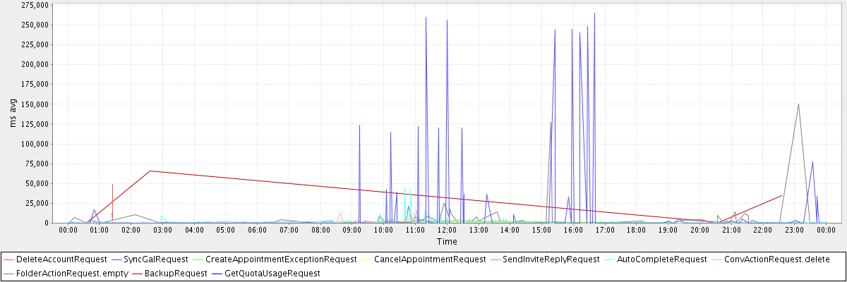 avg(DeleteAccountRequest) = 21459.33 avg(SyncGalRequest) = 11219.80 avg(CreateAppointmentExceptionRequest) = 934.40 avg(CancelAppointmentRequest) = 715.75 avg(SendInviteReplyRequest) = 809.93 avg(AutoCompleteRequest) = 1050.46 avg(ConvActionRequest.delete) = 1447.19 avg(FolderActionRequest.empty) = 6044.76 avg(BackupRequest) = 25395.75 avg(GetQuotaUsageRequest) = 1345.00