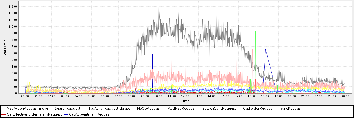 max(MsgActionRequest.move) = 334.00 max(SearchRequest) = 159.00 max(MsgActionRequest.delete) = 937.00 max(NoOpRequest) = 195.00 max(AddMsgRequest) = 163.00 max(SearchConvRequest) = 87.00 max(GetFolderRequest) = 928.00 max(SyncRequest) = 1314.00 max(GetEffectiveFolderPermsRequest) = 85.00 max(GetAppointmentRequest) = 657.00