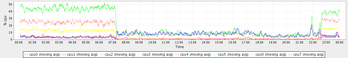 avg(cpu0) = 1.76 avg(cpu1) = 0.19 avg(cpu2) = 0.31 avg(cpu3) = 0.16 avg(cpu4) = 0.13 avg(cpu5) = 0.12 avg(cpu6) = 0.20 avg(cpu7) = 0.13