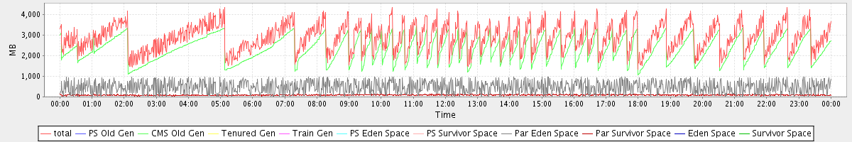 avg(total) = 2865.30 avg(PS Old Gen) = 0.00 avg(CMS Old Gen) = 2298.05 avg(Tenured Gen) = 0.00 avg(Train Gen) = 0.00 avg(PS Eden Space) = 0.00 avg(PS Survivor Space) = 0.00 avg(Par Eden Space) = 478.70 avg(Par Survivor Space) = 88.55 avg(Eden Space) = 0.00 avg(Survivor Space) = 0.00