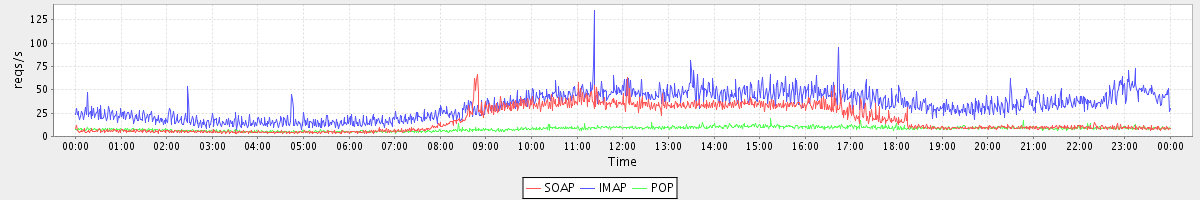 Host zm03.stanford.edu: Mailboxd: Request Rate by Client Protocol