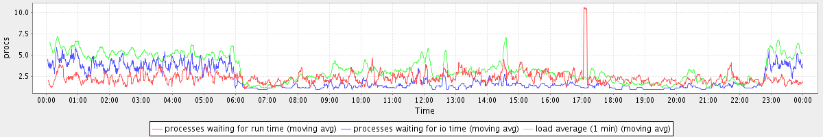 avg(processes waiting for run time) = 1.63 avg(processes waiting for io time) = 1.61 avg(load average (1 min)) = 3.42