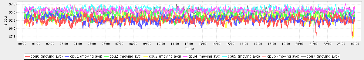 avg(cpu0) = 92.62 avg(cpu1) = 92.85 avg(cpu2) = 93.71 avg(cpu3) = 93.31 avg(cpu4) = 95.38 avg(cpu5) = 95.79 avg(cpu6) = 95.24 avg(cpu7) = 95.08