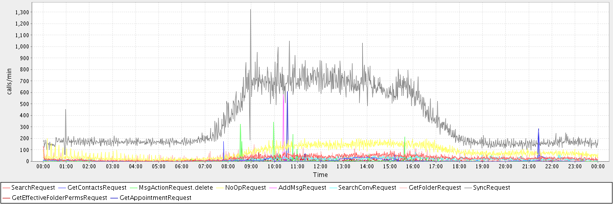 max(SearchRequest) = 128.00 max(GetContactsRequest) = 265.00 max(MsgActionRequest.delete) = 342.00 max(NoOpRequest) = 200.00 max(AddMsgRequest) = 581.00 max(SearchConvRequest) = 80.00 max(GetFolderRequest) = 167.00 max(SyncRequest) = 1322.00 max(GetEffectiveFolderPermsRequest) = 78.00 max(GetAppointmentRequest) = 607.00