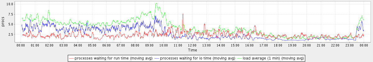 avg(processes waiting for run time) = 1.59 avg(processes waiting for io time) = 2.27 avg(load average (1 min)) = 4.20