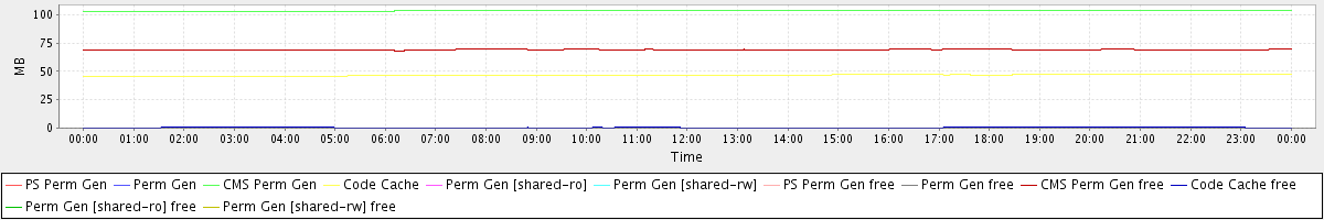 avg(PS Perm Gen) = 0.00 avg(Perm Gen) = 0.00 avg(CMS Perm Gen) = 103.54 avg(Code Cache) = 46.64 avg(Perm Gen [shared-ro]) = 0.00 avg(Perm Gen [shared-rw]) = 0.00 avg(PS Perm Gen free) = 0.00 avg(Perm Gen free) = 0.00 avg(CMS Perm Gen free) = 69.13 avg(Code Cache free) = 0.46 avg(Perm Gen [shared-ro] free) = 0.00 avg(Perm Gen [shared-rw] free) = 0.00
