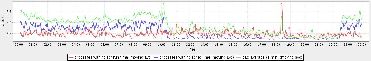 avg(processes waiting for run time) = 1.76 avg(processes waiting for io time) = 2.27 avg(load average (1 min)) = 4.31