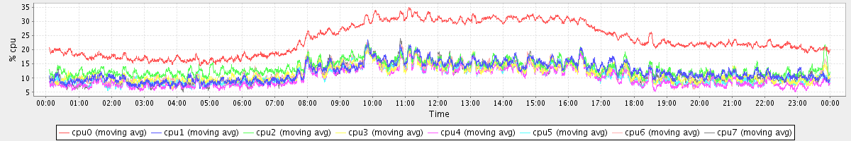 avg(cpu0) = 2.09 avg(cpu1) = 0.26 avg(cpu2) = 0.37 avg(cpu3) = 0.22 avg(cpu4) = 0.15 avg(cpu5) = 0.18 avg(cpu6) = 0.25 avg(cpu7) = 0.18