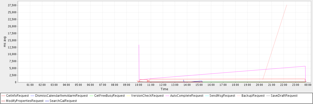 avg(GetInfoRequest) = 546.40 avg(DismissCalendarItemAlarmRequest) = 319.00 avg(GetFreeBusyRequest) = 146.67 avg(VersionCheckRequest) = 473.00 avg(AutoCompleteRequest) = 3644.50 avg(SendMsgRequest) = 319.00 avg(BackupRequest) = 14301.00 avg(SaveDraftRequest) = 250.50 avg(ModifyPropertiesRequest) = 151.00 avg(SearchGalRequest) = 283.80