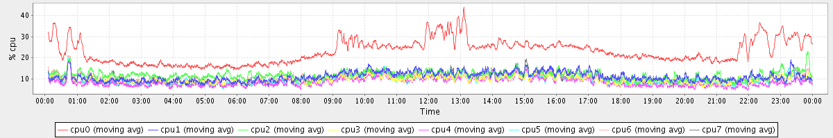 avg(cpu0) = 22.80 avg(cpu1) = 10.90 avg(cpu2) = 11.72 avg(cpu3) = 9.87 avg(cpu4) = 8.38 avg(cpu5) = 9.41 avg(cpu6) = 10.15 avg(cpu7) = 10.03
