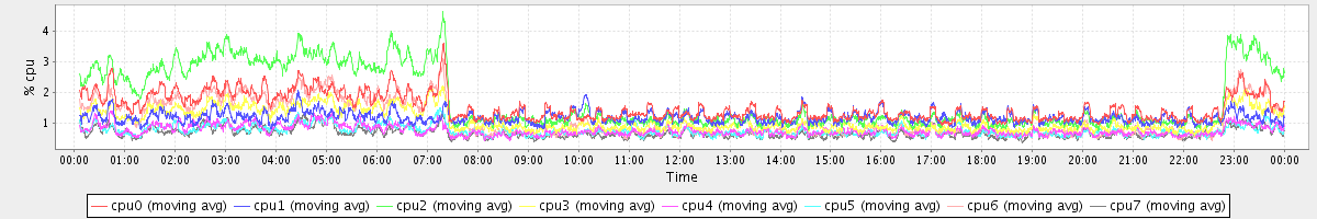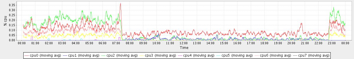 avg(cpu0) = 1.44 avg(cpu1) = 0.16 avg(cpu2) = 0.24 avg(cpu3) = 0.12 avg(cpu4) = 0.11 avg(cpu5) = 0.09 avg(cpu6) = 0.14 avg(cpu7) = 0.10