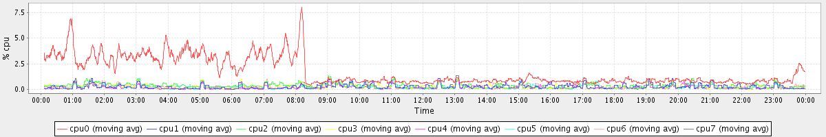 avg(cpu0) = 1.70 avg(cpu1) = 0.27 avg(cpu2) = 0.35 avg(cpu3) = 0.25 avg(cpu4) = 0.17 avg(cpu5) = 0.18 avg(cpu6) = 0.25 avg(cpu7) = 0.19