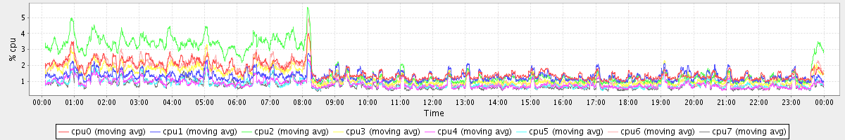 avg(cpu0) = 2.09 avg(cpu1) = 5.84 avg(cpu2) = 20.74 avg(cpu3) = 5.45 avg(cpu4) = 1.36 avg(cpu5) = 1.38 avg(cpu6) = 12.44 avg(cpu7) = 1.61