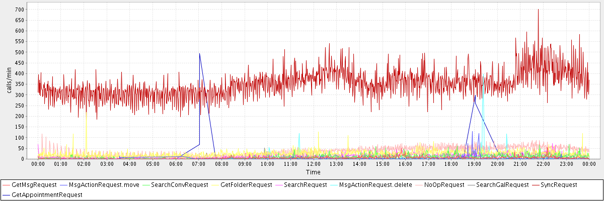 max(GetMsgRequest) = 55.00 max(MsgActionRequest.move) = 129.00 max(SearchConvRequest) = 67.00 max(GetFolderRequest) = 218.00 max(SearchRequest) = 72.00 max(MsgActionRequest.delete) = 398.00 max(NoOpRequest) = 117.00 max(SearchGalRequest) = 51.00 max(SyncRequest) = 700.00 max(GetAppointmentRequest) = 493.00