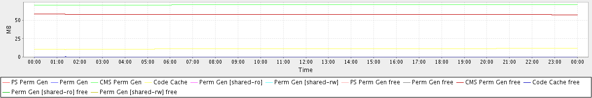 avg(PS Perm Gen) = 0.00 avg(Perm Gen) = 0.00 avg(CMS Perm Gen) = 71.13 avg(Code Cache) = 11.26 avg(Perm Gen [shared-ro]) = 0.00 avg(Perm Gen [shared-rw]) = 0.00 avg(PS Perm Gen free) = 0.00 avg(Perm Gen free) = 0.00 avg(CMS Perm Gen free) = 57.87 avg(Code Cache free) = 0.14 avg(Perm Gen [shared-ro] free) = 0.00 avg(Perm Gen [shared-rw] free) = 0.00