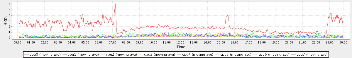 avg(cpu0) = 1.92 avg(cpu1) = 0.27 avg(cpu2) = 0.37 avg(cpu3) = 0.23 avg(cpu4) = 0.17 avg(cpu5) = 0.17 avg(cpu6) = 0.29 avg(cpu7) = 0.19