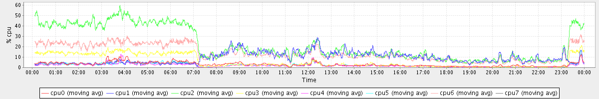 avg(cpu0) = 3.13 avg(cpu1) = 9.03 avg(cpu2) = 22.09 avg(cpu3) = 5.88 avg(cpu4) = 1.94 avg(cpu5) = 2.27 avg(cpu6) = 14.20 avg(cpu7) = 2.25