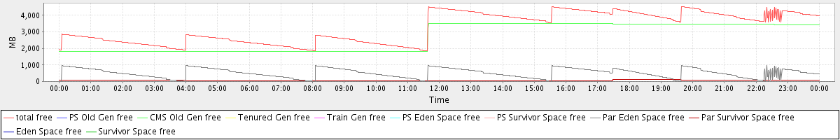 avg(total free) = 3258.45 avg(PS Old Gen free) = 0.00 avg(CMS Old Gen free) = 2673.01 avg(Tenured Gen free) = 0.00 avg(Train Gen free) = 0.00 avg(PS Eden Space free) = 0.00 avg(PS Survivor Space free) = 0.00 avg(Par Eden Space free) = 514.68 avg(Par Survivor Space free) = 70.76 avg(Eden Space free) = 0.00 avg(Survivor Space free) = 0.00