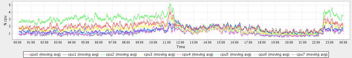 avg(cpu0) = 4.12 avg(cpu1) = 6.97 avg(cpu2) = 28.72 avg(cpu3) = 8.74 avg(cpu4) = 2.60 avg(cpu5) = 3.26 avg(cpu6) = 18.73 avg(cpu7) = 3.20