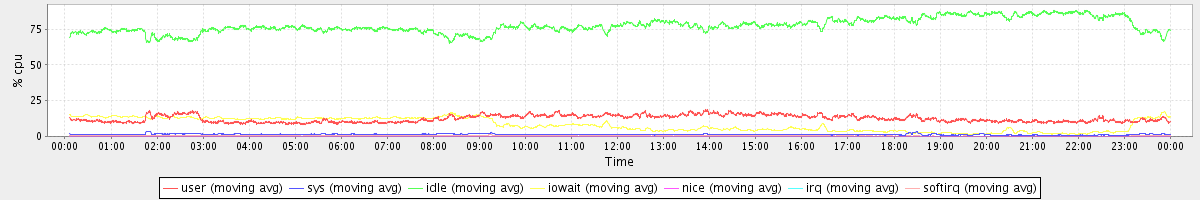 avg(user) = 12.45 avg(sys) = 1.39 avg(idle) = 77.49 avg(iowait) = 8.20 avg(nice) = 0.00 avg(irq) = 0.04 avg(softirq) = 0.43