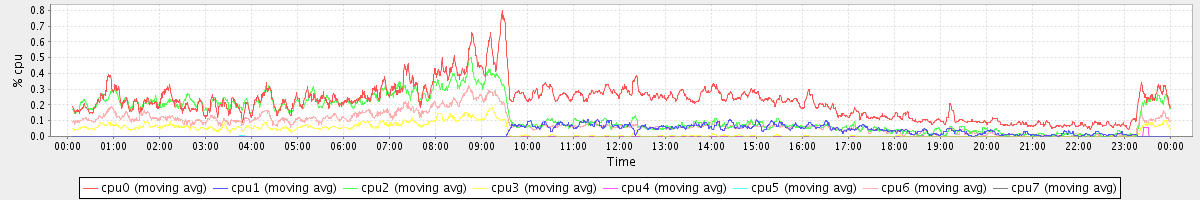 avg(cpu0) = 2.34 avg(cpu1) = 0.27 avg(cpu2) = 0.38 avg(cpu3) = 0.25 avg(cpu4) = 0.18 avg(cpu5) = 0.18 avg(cpu6) = 0.28 avg(cpu7) = 0.18