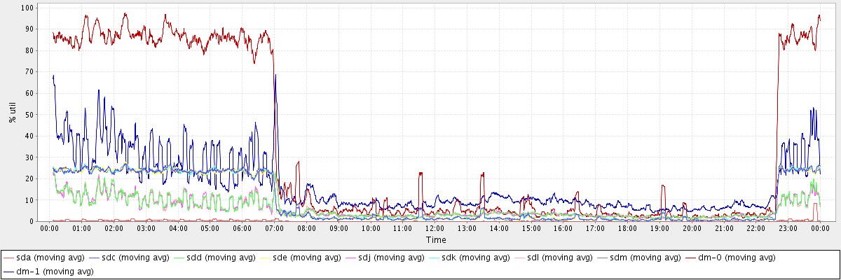 avg(sda) = 0.31 avg(sdc) = 9.29 avg(sdd) = 5.79 avg(sde) = 9.23 avg(sdj) = 5.74 avg(sdk) = 9.27 avg(sdl) = 5.79 avg(sdm) = 9.27 avg(dm-0) = 33.64 avg(dm-1) = 16.99