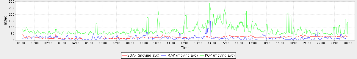max(SearchConvRequest) = 52.00 max(GetFolderRequest) = 292.00 max(SearchRequest) = 127.00 max(ItemActionRequest.delete) = 601.00 max(MsgActionRequest.delete) = 844.00 max(NoOpRequest) = 87.00 max(SyncRequest) = 451.00 max(GetEffectiveFolderPermsRequest) = 52.00 max(ConvActionRequest.trash) = 44.00 max(GetAppointmentRequest) = 689.00