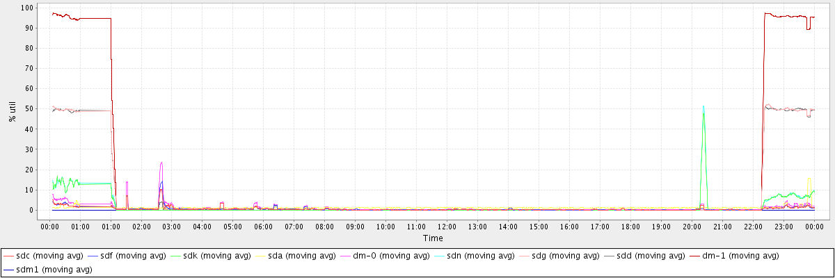 avg(sdc) = 0.55 avg(sdf) = 0.55 avg(sdk) = 1.42 avg(sda) = 1.24 avg(dm-0) = 1.03 avg(sdn) = 1.45 avg(sdg) = 5.80 avg(sdd) = 5.80 avg(dm-1) = 11.18 avg(sdm1) = 0.00