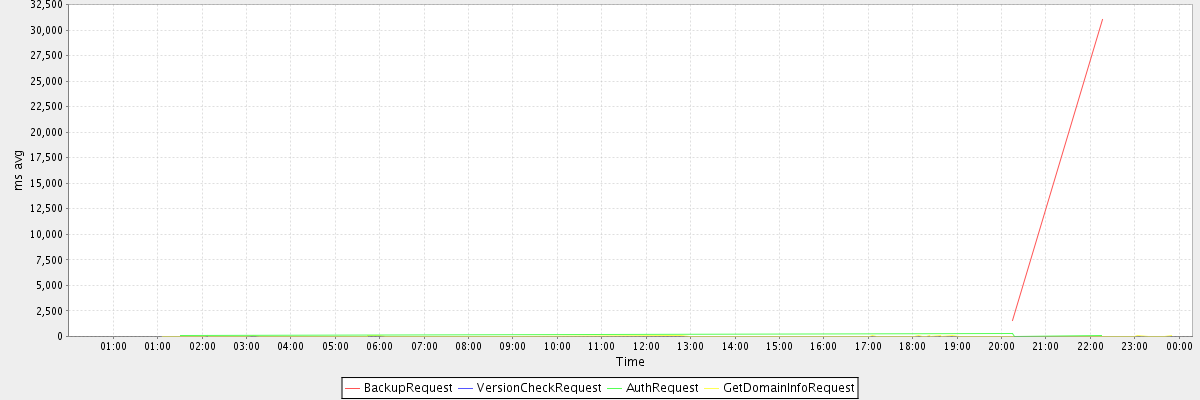 avg(BackupRequest) = 16280.00 avg(VersionCheckRequest) = 533.00 avg(AuthRequest) = 112.50 avg(GetDomainInfoRequest) = 4.35